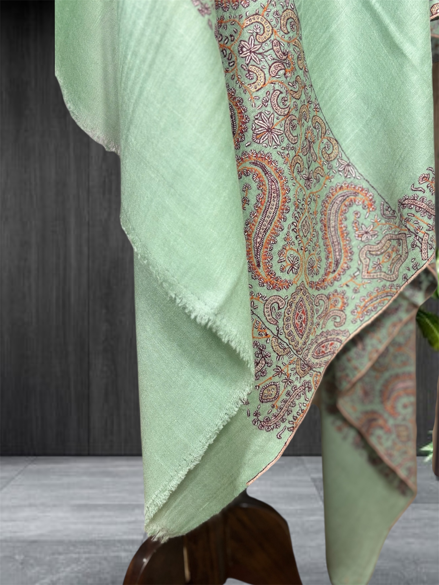 This mint green pure pashmina shawl with paisley border is handcrafted in Kashmir using traditional techniques. Made from 100% original pashmina wool, it offers exceptional softness, warmth, and breathable comfort.
