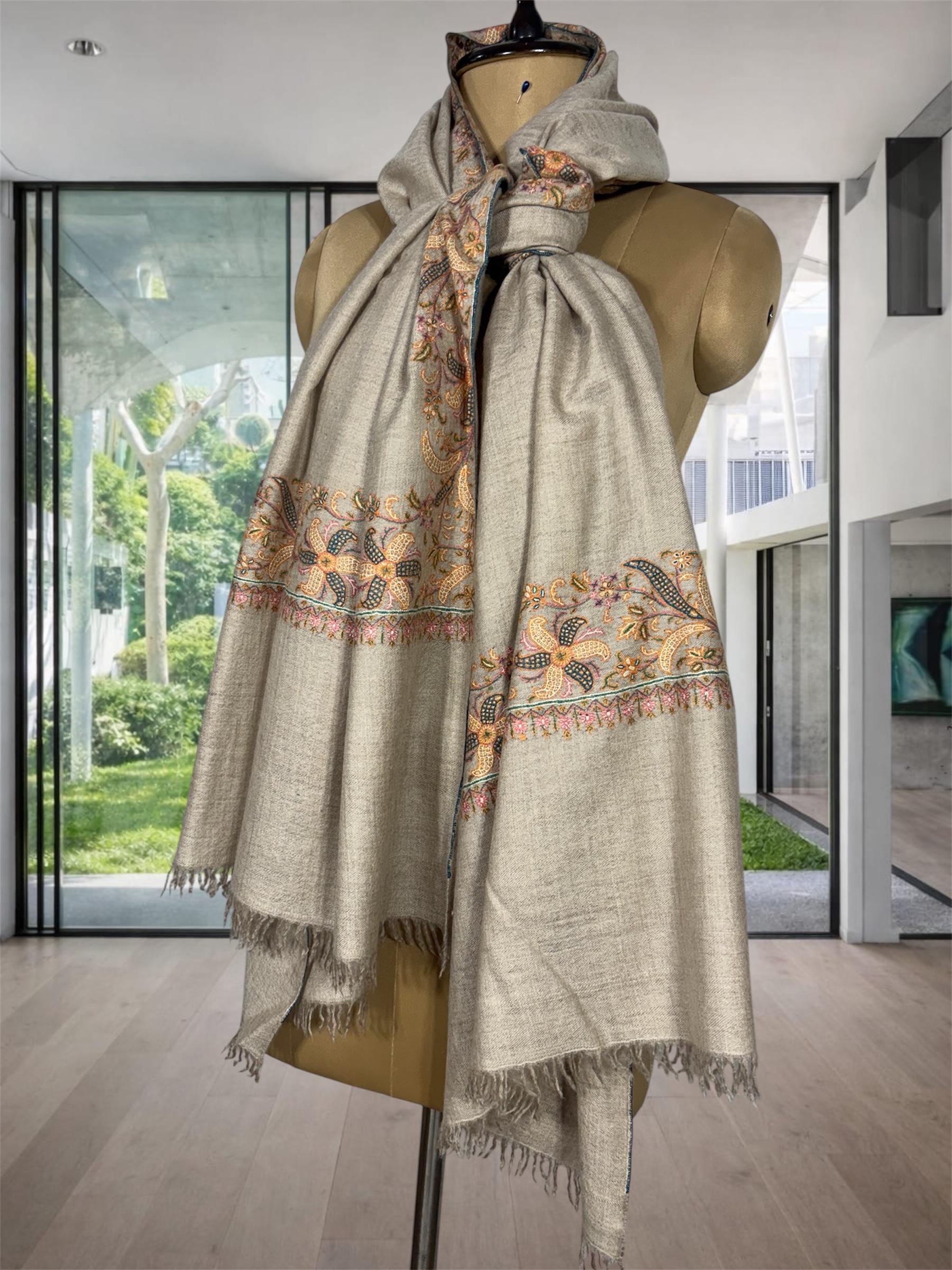 This natural colour pure pashmina shawl with elegant border is handcrafted in Kashmir using traditional weaving techniques. Made from 100% original pashmina wool, it offers unmatched softness, warmth, and breathable comfort.